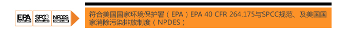 認證/規范 | 符合美國環境保護署(EPA)EPA 40 CFR 264.175與泄漏預防和控制法案(SPCC)規范、及美國消除污染排放制度(NPDES) |