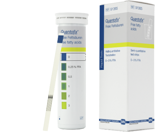 德國MN推出游離脂肪酸測試條,用于檢測煎炸油或脂肪中游離脂肪酸含量 (% FFA) ,測試范圍為0-3% FFA。非常適合在現場快速輕松地分析各種油和脂肪,即使是熱油也能輕松檢測。德國MN游離脂肪酸測試條91365可輕松實現可靠的質量控制和產品評估。